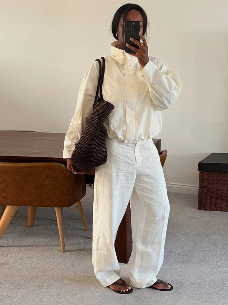 Diese Windjacke hat eine lockere Passform mit langen Ärmeln und ist ideal für wechselhaftes Wetter. Sie besteht aus ultraleichtem, atmungsaktivem Material und verfügt über einen verstellbaren Kordelzug in der Taille (Drawstring Waist Cinching) für eine schmeichelhafte Silhouette und einen Reißverschluss. Die kürzere Länge eignet sich perfekt zum Kombinieren mit hoch taillierten Hosen.