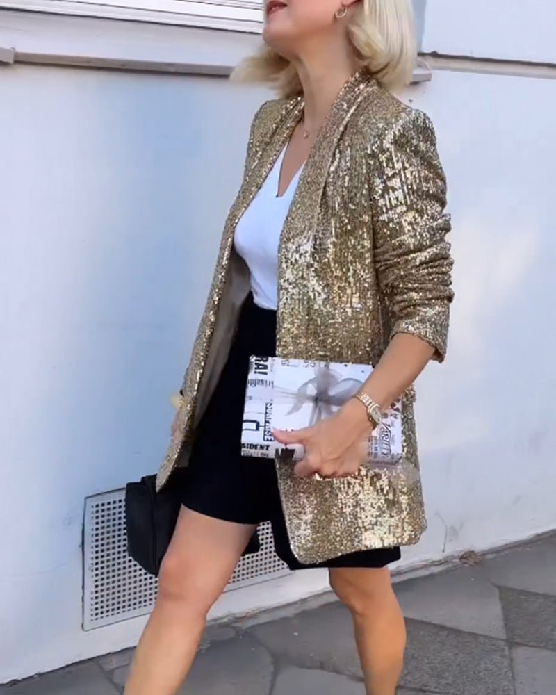 Tritt in dieser Weihnachtszeit mit unserem Gold Paillettenblazer ins Rampenlicht. Dieser schillernde Blazer ist perfekt für jedes Weihnachtsoutfit und kombiniert Raffinesse mit einem Hauch Glitzer. Egal, ob du eine festliche Party oder einen Abend in der Stadt verbringst, dieser Paillettenblazer wird garantiert alle Blicke auf sich ziehen. Ein Must-have für deine Weihnachtsgarderobe, das jedes Ensemble mit seinem glamourösen, schimmernden Stil aufwertet.