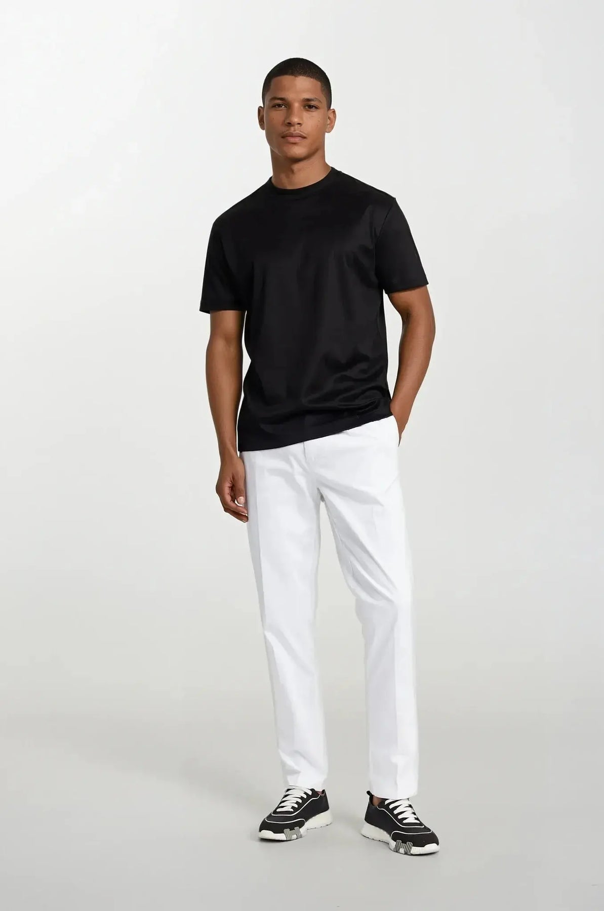 Erlebe zeitlose Eleganz mit dem Schwarzes T-Shirt das für modebewusste Männer entworfen wurde, die sowohl Stil als auch Komfort verlangen. Aus hochwertigen Materialien und mit viel Liebe zum Detail gefertigt, bietet dieses schmal geschnittene T-Shirt eine schmeichelhafte Silhouette und hervorragende Haltbarkeit. Die glänzende Oberfläche unterstreicht den tiefschwarzen Farbton und verleiht jedem Outfit einen eleganten und raffinierten Touch. Ob lässig mit Jeans und Turnschuhen oder schick mit eleganten Hosen und Schuhen - mit diesem T-Shirt machst du garantiert immer einen guten Eindruck.